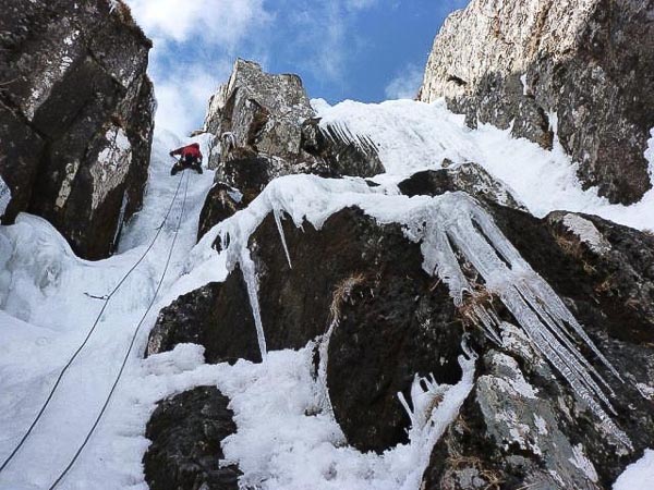 John Mackenzie on the first ascent of a new V,5 gully on Garbh Choire on Sgurr na Lapaich in Strathfarrar. (Photo Simon Nadin)