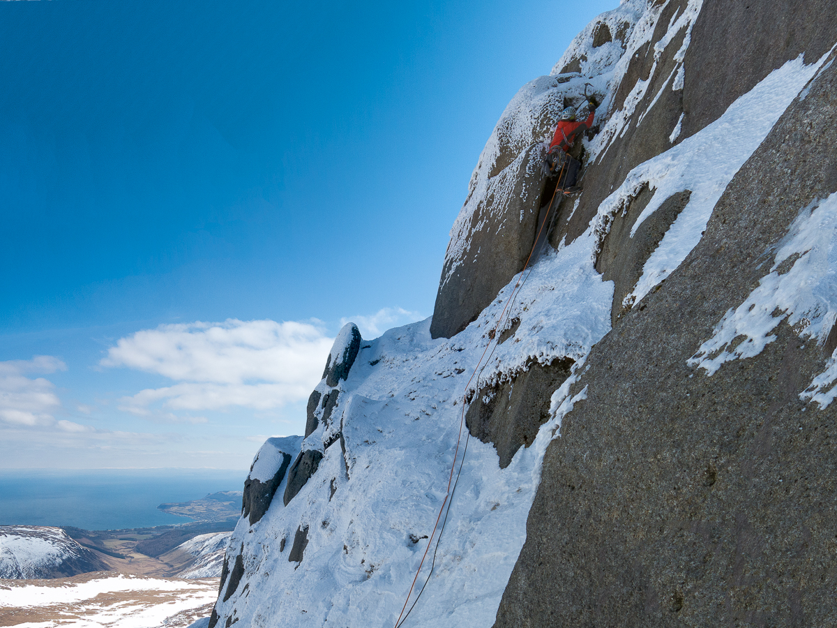 Stuart McFarlane climbing the final chimney on After the Storm (VI,5) on Beinn Nuis. Glen Rosa, Brodick and the Scottish mainland can be seen in the far distance. (Photo Simon Richardson)
