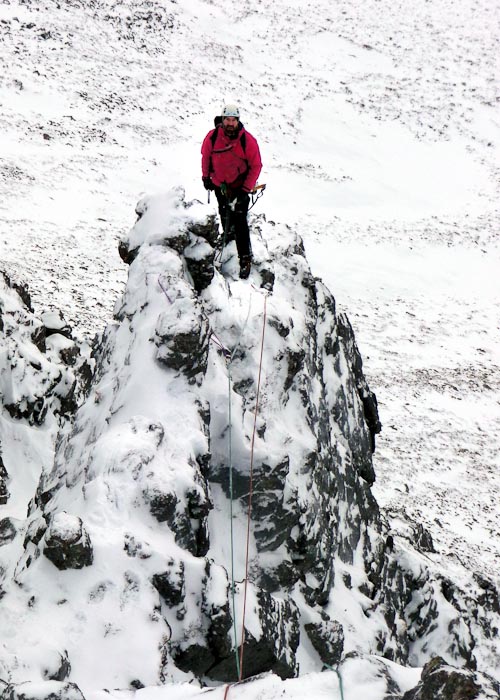 John Lyall on the upper crest of Gael Force Ridge (IV,5), Coire Garbhlach in Glen Feshie. (Photo Andy Nisbet)