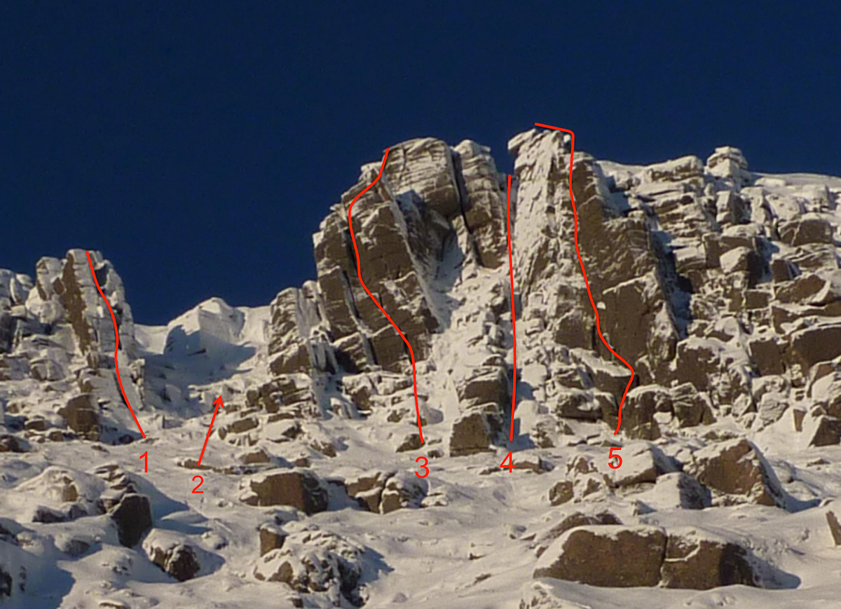 The Anvil Buttress area of Creagan Cha-no on Cairngorm. (Click on photo for larger image). 1. Chimney Rib (IV,4), 2. Recovery Gully (I), 3. Flaked Out (VI,7), 4. Anvil Gully (IV,4), 5. Anvil Corner (VI,6). Jenga Buttress (III,4) is the next major rib off photo to the right. To the right of this is Arch Wall. (Archive Photo Sandy Simpson)