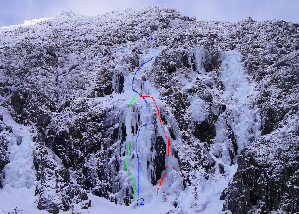 The ice routes climbed two seasons ago by Andy Turner and Ruth Taylor on the north side of Am Bodach in the Mamores. (Click on photo for larger image). 1. The Hemulen (V,5), 2. Little My (IV,4), 3. Snufkin (IV,4). (Archive Photo Ruth Taylor)