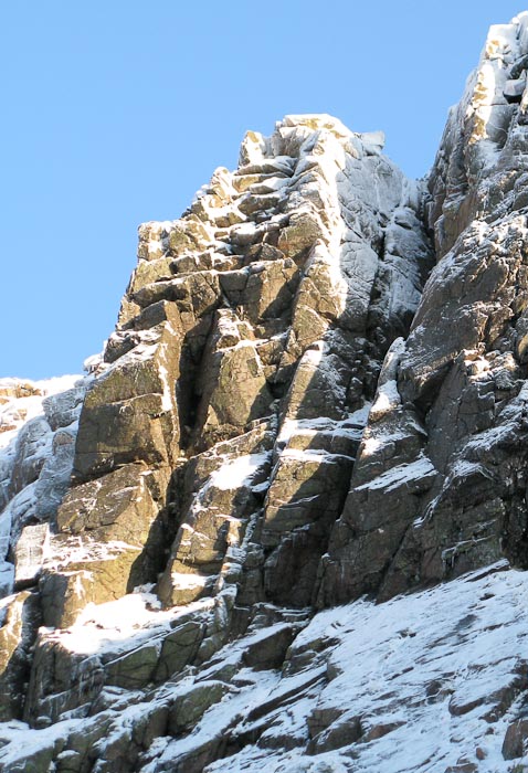 The Forgotten Pinnacle in Coire nan Clach on Braeriach. Roger Everett and I climbed the right-hand groove (just left of the V-chimney) to gain the summit before continuing up the ridge on the right. We may have been the first people stand atop this miniature Cairngorm summit. (Archive Photo Simon Richardson)